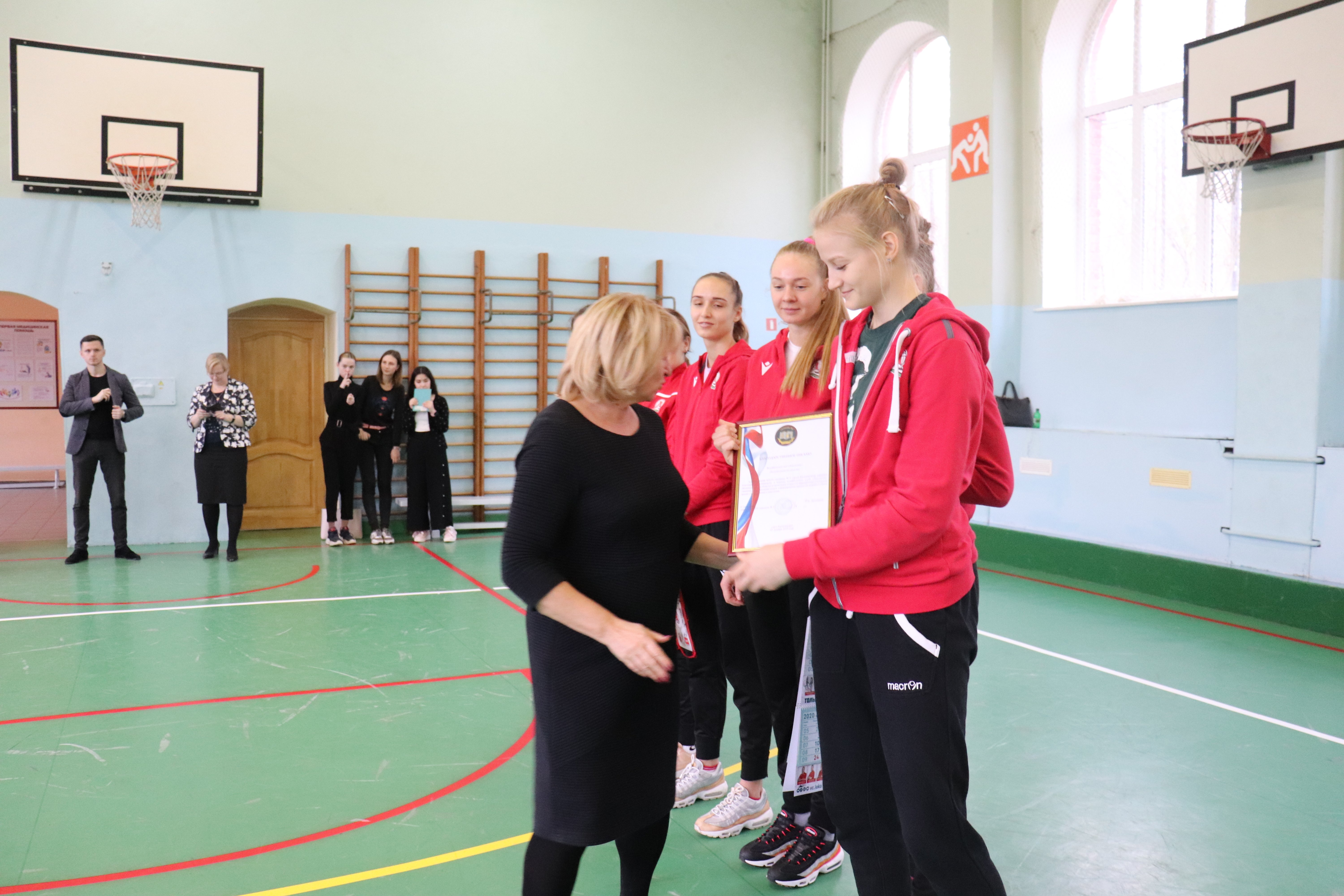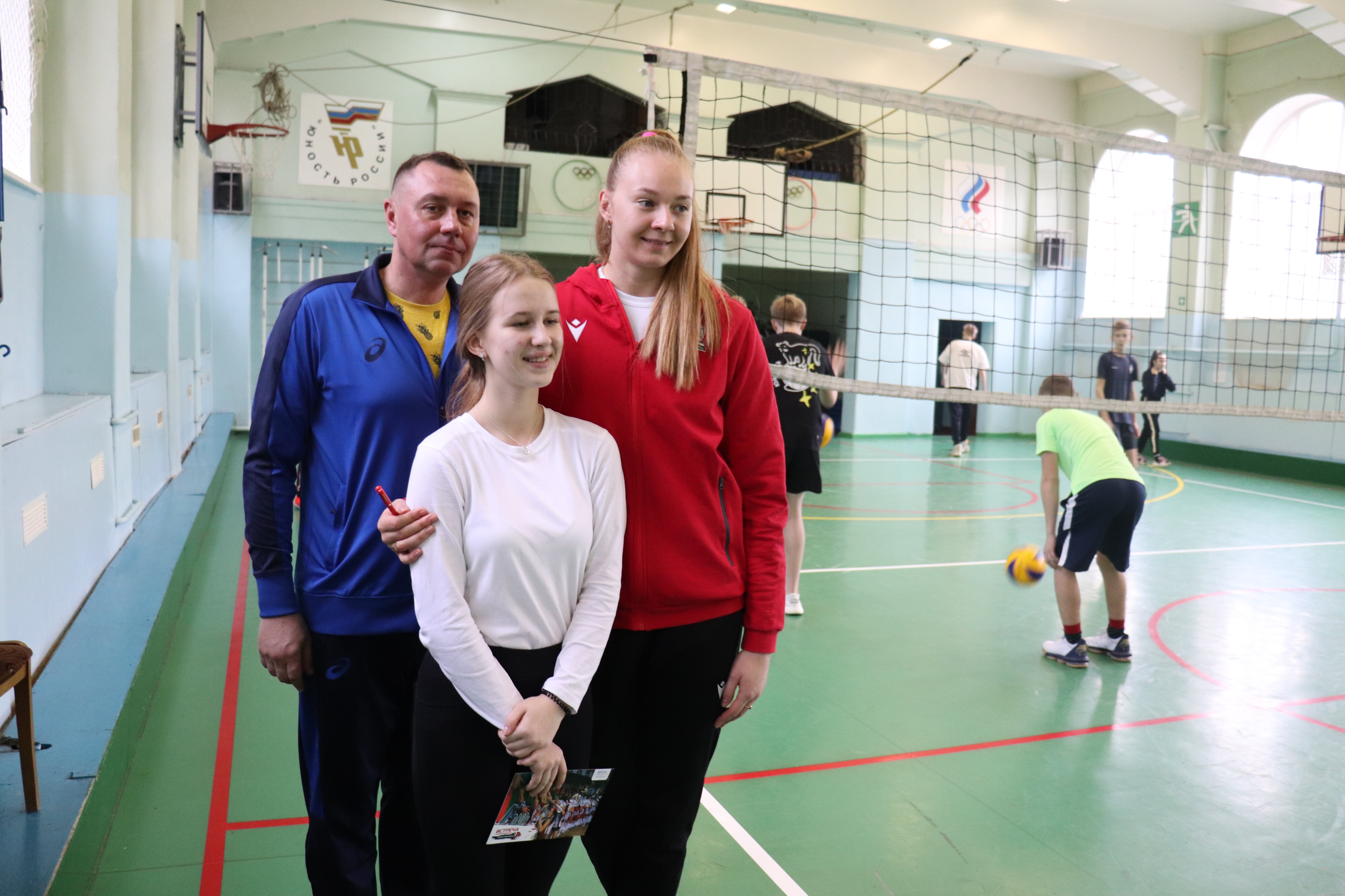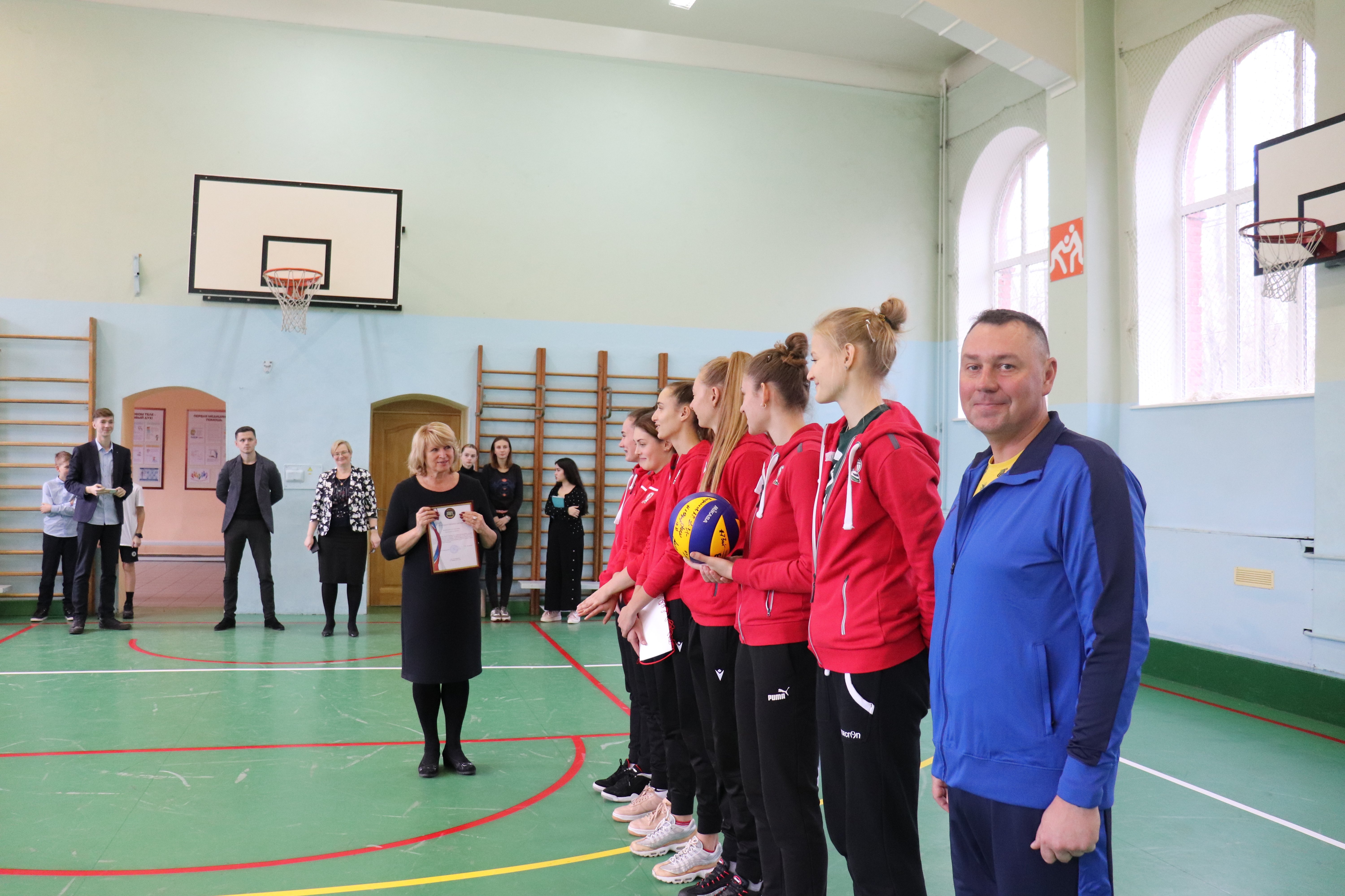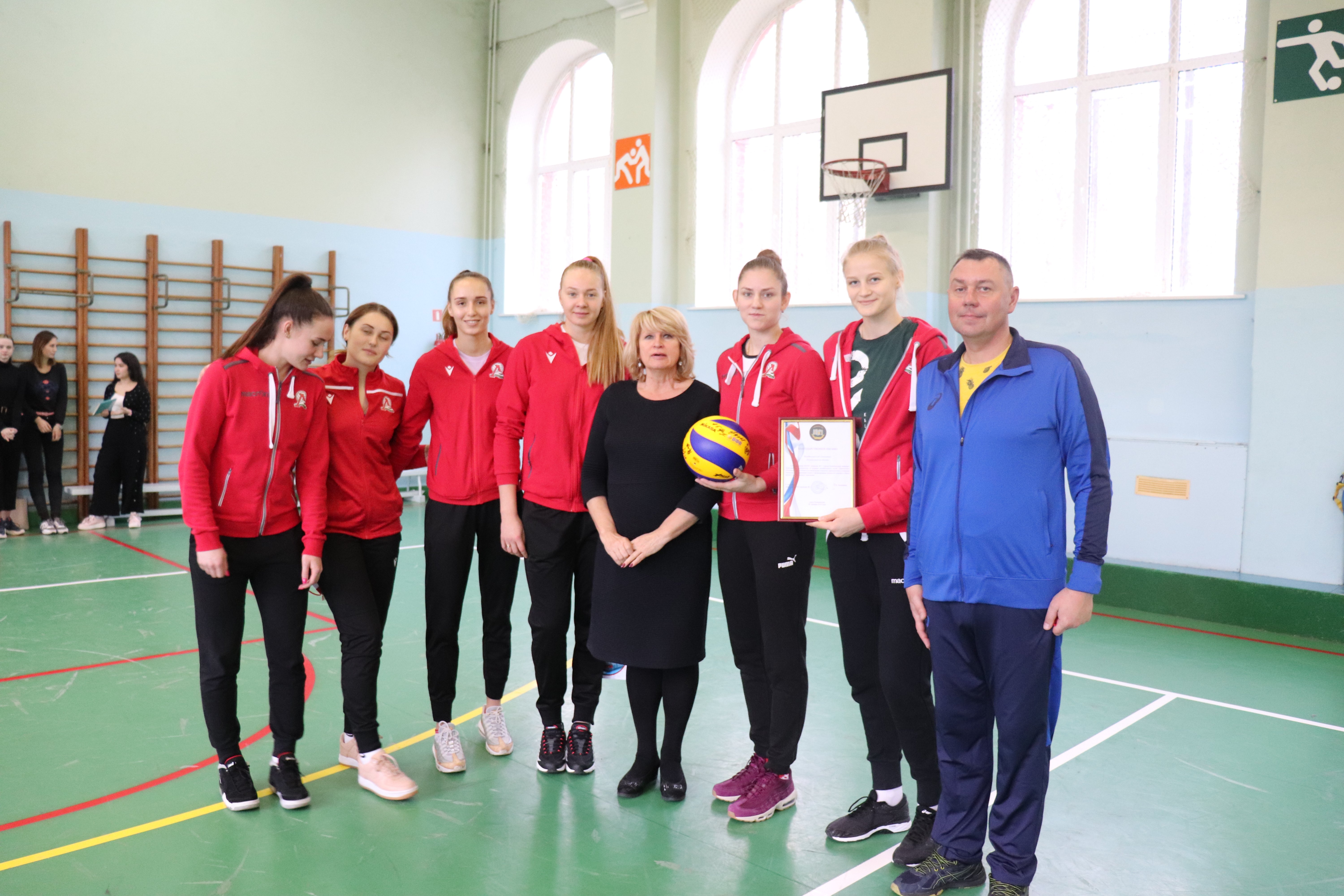 После урока наши игроки вручили директору гимназии Галине Алексеевне Лисичкиной и руководителю кафедры физической культуры Алексею Михайловичу Котельникову подарки от клуба – мячи, календарь и вымпел с автографами всех игроков «Локомотива». Успели волейболистки пообщаться и с учениками гимназии – были и сэлфи, и автографы. И даже интервью для гимназической газеты. В завершении встречи волейболистки пригласили учеников и преподавателей на игры «Локомотива» и пообещали, что ещё раз придут в гости к ребятам.